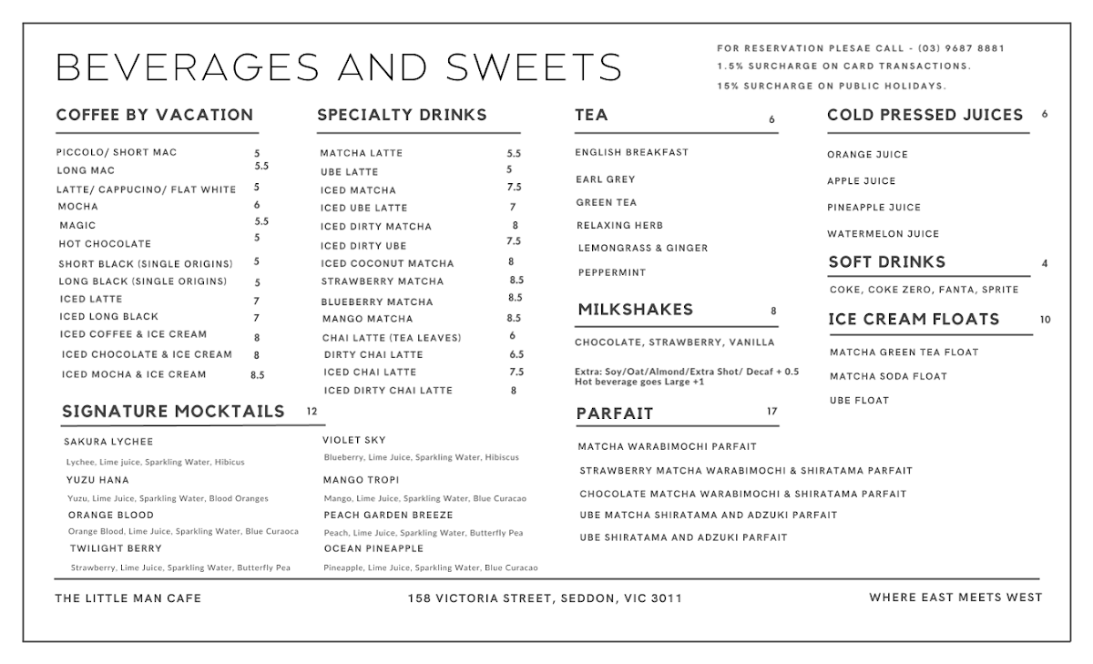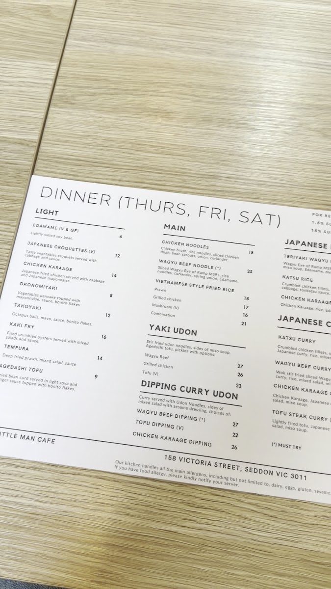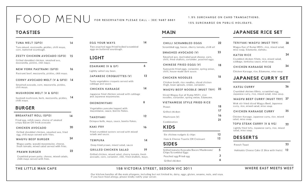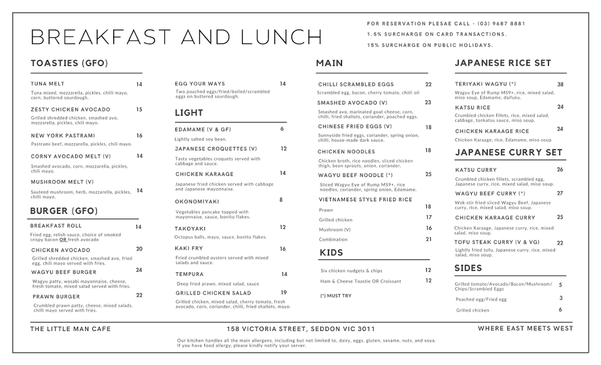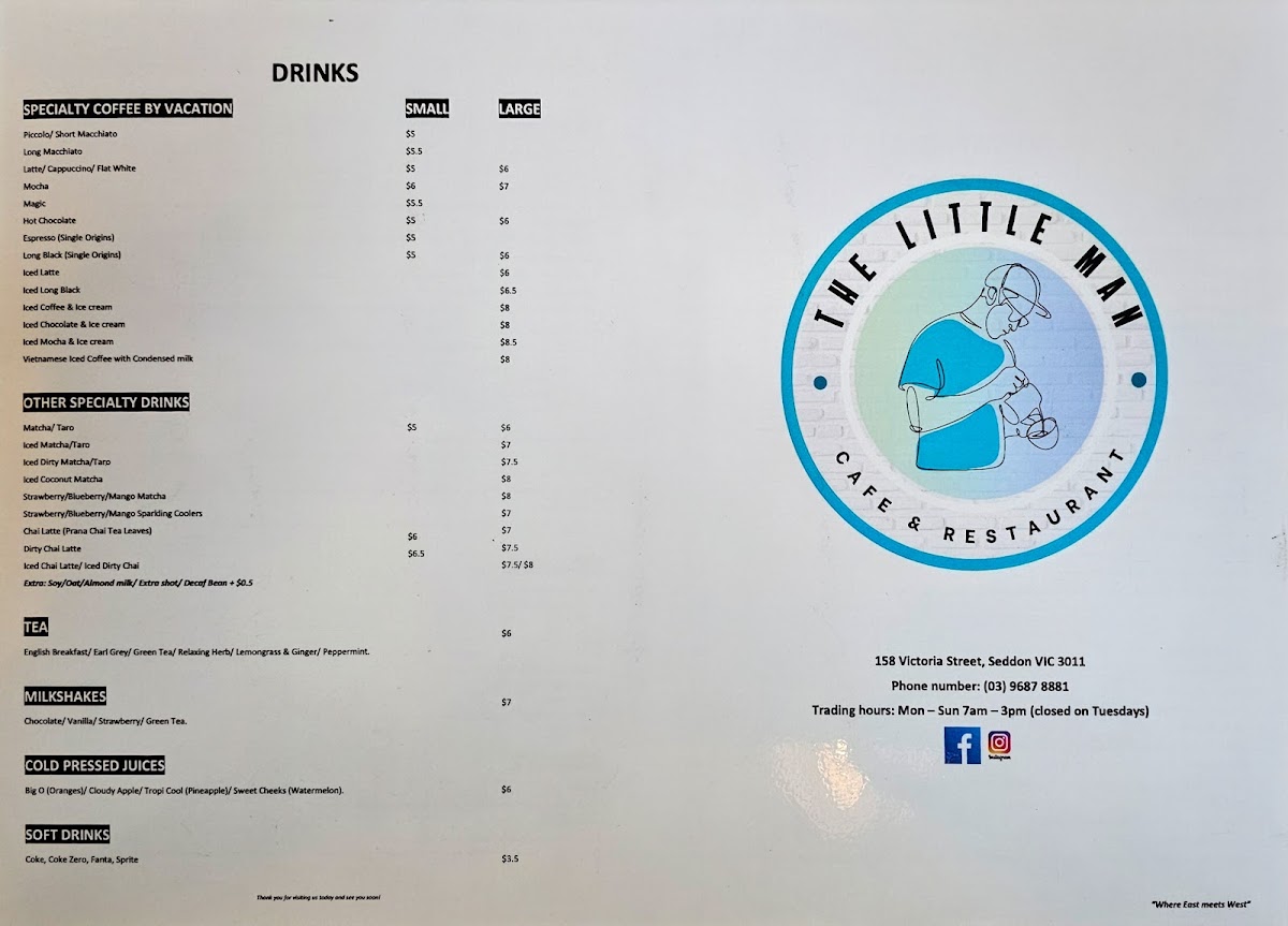 The menu at The Little Man on 158 Victoria St, Seddon is a playful and diverse mix that caters to breakfast lovers, casual lunch seekers, and comfort-food enthusiasts alike. The toasties section offers staples like Simply Toast, Eggs your way, and indulgent options such as the Tuna Melt Sandwich (GFO), Zesty Chicken Avocado Sandwich (GFO), and New York Beef Pastrami Sandwich (GFO). Burger fans can enjoy the Breakfast Roll, Chicken Avocado Burger, Wagyu Beef Burger, or the standout Prawn Burger, while lighter bites include Edamame (V & GF), Japanese Croquete (V), Chicken Karaage, Okonomiyaki, and Takoyaki. For mains, highlights like Chilli Scrambled Eggs, Smashed Avocado (V), Chinese Fried Egg, Signature Chicken Pho, and the must-try Wagyu Beef Noodles showcase a clever balance of classic breakfast and hearty Asian-inspired dishes. Japanese rice and curry sets, including Chicken Katsu Rice, Teriyaki Wagyu Beef Premium Rice Set, Chicken Karaage Rice, Chicken Katsu Curry, Wagyu Beef Curry, Chicken Karaage Curry, and Tofu Steak Curry, bring comforting flavors to the table. The menu also thoughtfully caters to younger diners with Six Chicken Nuggets with Fries and Ham & Cheese Croissant/Toastie. Complementary sides like Poached Egg/Fried Egg, Scrambled Eggs, Grilled Tomato, Avocado, and Bacon round out meals, while desserts such as French Toast and Hokkaido Cheese Cake provide sweet finishes. Beverage offerings are equally varied, from specialty coffee by Vacation, including Piccolo/Short Macchiato, Long Macchiato, Latte/Cappuccino/Flat White, Mocha, and Magic, to creative drinks like Matcha/Taro Latte, Iced Dirty Matcha/Taro, and Strawberry/Blueberry/Mango Matcha. Traditional teas-English Breakfast, Earl Grey, Jasmine Green, Relaxing Herb, and Lemongrass & Ginger Tea-alongside milkshakes and cold-pressed juices, make it a menu that’s both comprehensive and approachable. Every section feels thoughtfully curated, offering a satisfying range that balances comfort, indulgence, and freshness in a way that makes The Little Man a destination for all-day enjoyment.