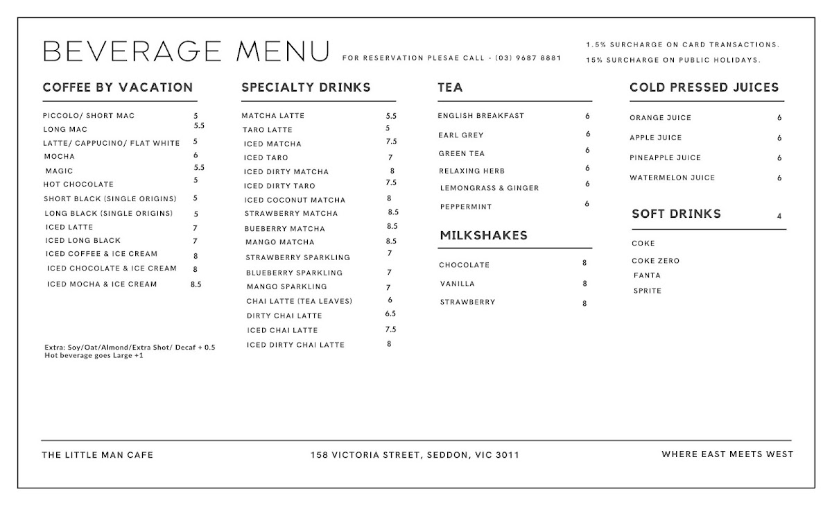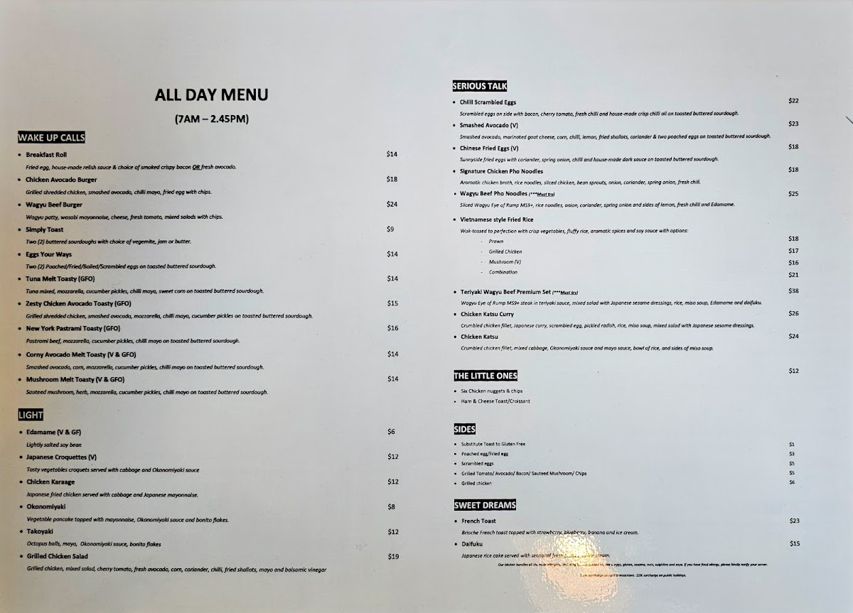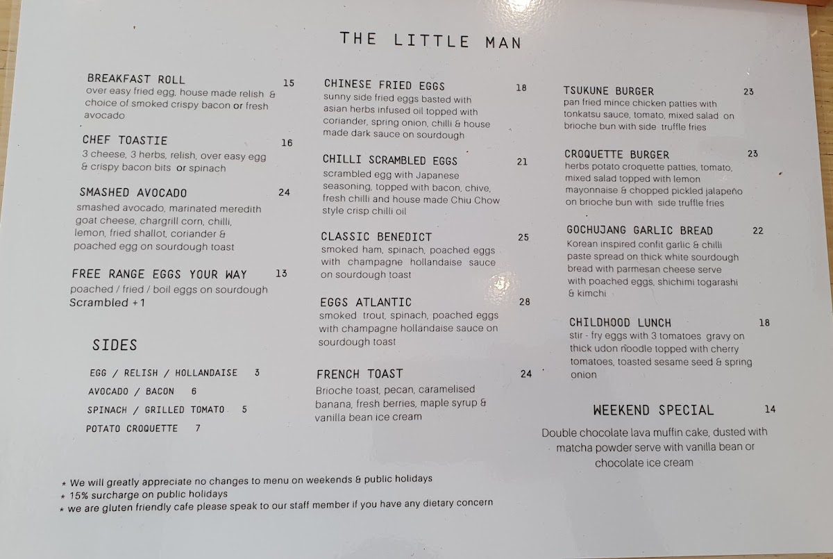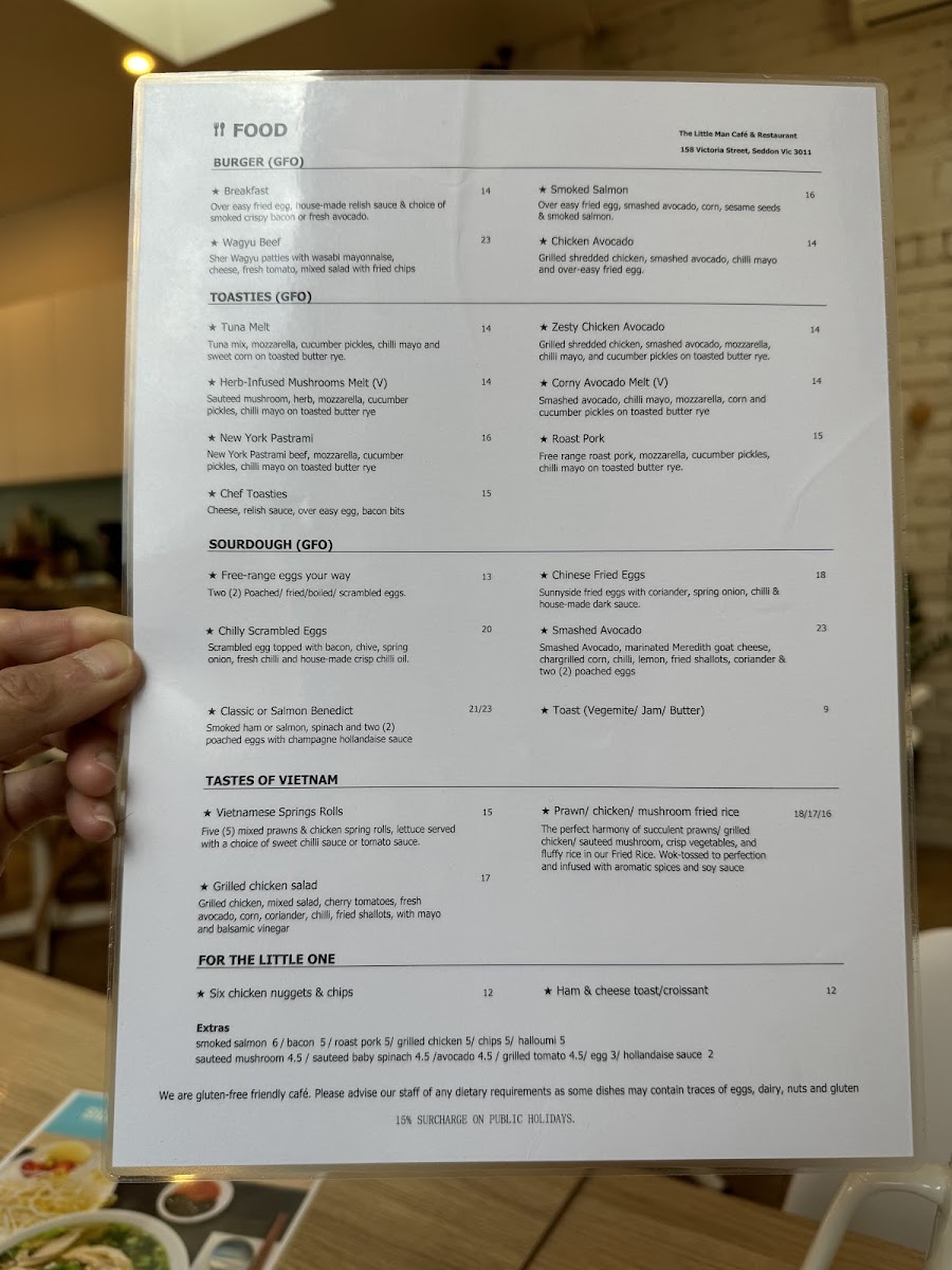 The menu at The Little Man on 158 Victoria St, Seddon is a playful and diverse mix that caters to breakfast lovers, casual lunch seekers, and comfort-food enthusiasts alike. The toasties section offers staples like Simply Toast, Eggs your way, and indulgent options such as the Tuna Melt Sandwich (GFO), Zesty Chicken Avocado Sandwich (GFO), and New York Beef Pastrami Sandwich (GFO). Burger fans can enjoy the Breakfast Roll, Chicken Avocado Burger, Wagyu Beef Burger, or the standout Prawn Burger, while lighter bites include Edamame (V & GF), Japanese Croquete (V), Chicken Karaage, Okonomiyaki, and Takoyaki. For mains, highlights like Chilli Scrambled Eggs, Smashed Avocado (V), Chinese Fried Egg, Signature Chicken Pho, and the must-try Wagyu Beef Noodles showcase a clever balance of classic breakfast and hearty Asian-inspired dishes. Japanese rice and curry sets, including Chicken Katsu Rice, Teriyaki Wagyu Beef Premium Rice Set, Chicken Karaage Rice, Chicken Katsu Curry, Wagyu Beef Curry, Chicken Karaage Curry, and Tofu Steak Curry, bring comforting flavors to the table. The menu also thoughtfully caters to younger diners with Six Chicken Nuggets with Fries and Ham & Cheese Croissant/Toastie. Complementary sides like Poached Egg/Fried Egg, Scrambled Eggs, Grilled Tomato, Avocado, and Bacon round out meals, while desserts such as French Toast and Hokkaido Cheese Cake provide sweet finishes. Beverage offerings are equally varied, from specialty coffee by Vacation, including Piccolo/Short Macchiato, Long Macchiato, Latte/Cappuccino/Flat White, Mocha, and Magic, to creative drinks like Matcha/Taro Latte, Iced Dirty Matcha/Taro, and Strawberry/Blueberry/Mango Matcha. Traditional teas-English Breakfast, Earl Grey, Jasmine Green, Relaxing Herb, and Lemongrass & Ginger Tea-alongside milkshakes and cold-pressed juices, make it a menu that’s both comprehensive and approachable. Every section feels thoughtfully curated, offering a satisfying range that balances comfort, indulgence, and freshness in a way that makes The Little Man a destination for all-day enjoyment.